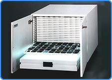 Einzelschrank mit 48 Dia-Sichtrahmen für 3024 Kleinbilddias. Beleuchtungssauszug, zwei Türen mit Sicherheitsschloß. BxHxT: 54x120x45 cm