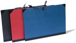3 Innenklappen, Verschluss aus schwarzem Ripsband , stabiler Karton, außen mit farbigem Buckrampapier kaschiert, schwarze Innenseiten, schwarzer Leinenrücken,